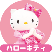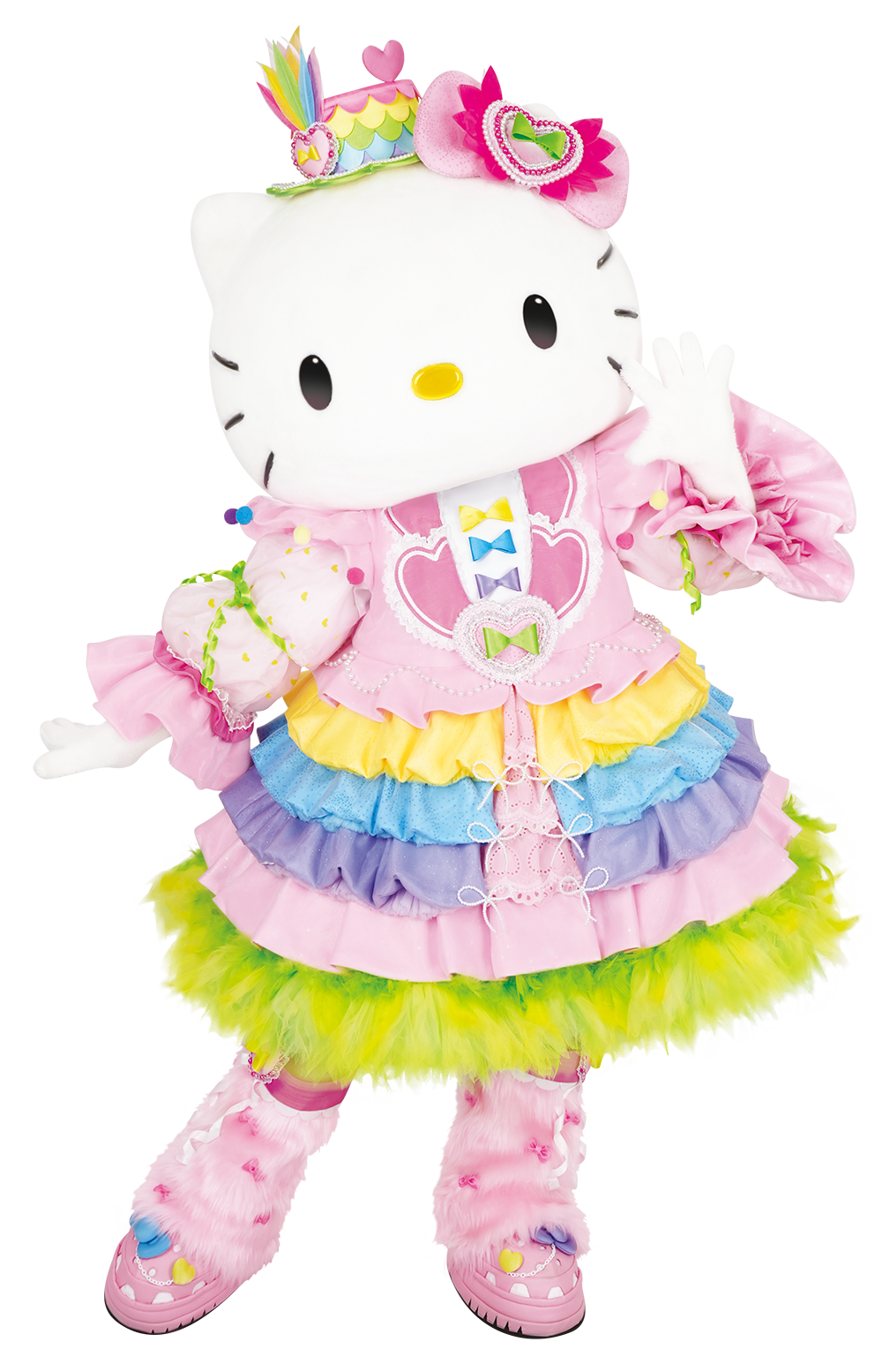ピンクを基調にレインボーカラーのフリルやフラワーモチーフのリボンをあしらった華やかなドレスのキティが35周年を彩ります。