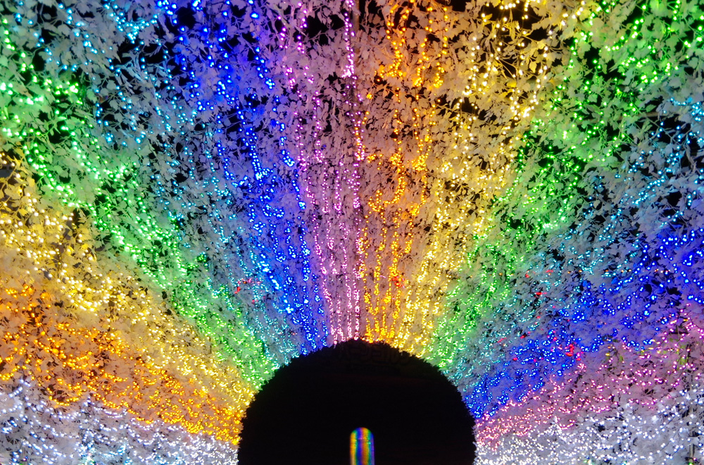 光きらめくプレゼント★虹色に輝く光のトンネルを抜けるとライトアップされたアトラクションが楽しめるよ